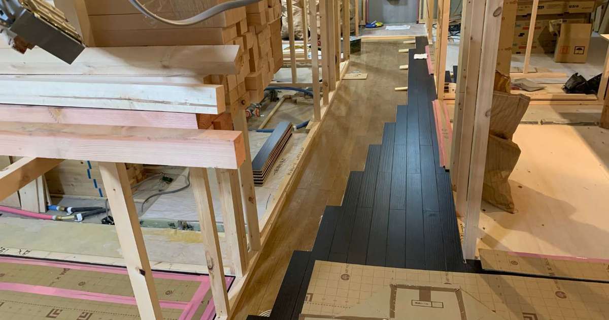 ベニヤ板が全て貼り終わり、次にフローリングを貼っていきます。