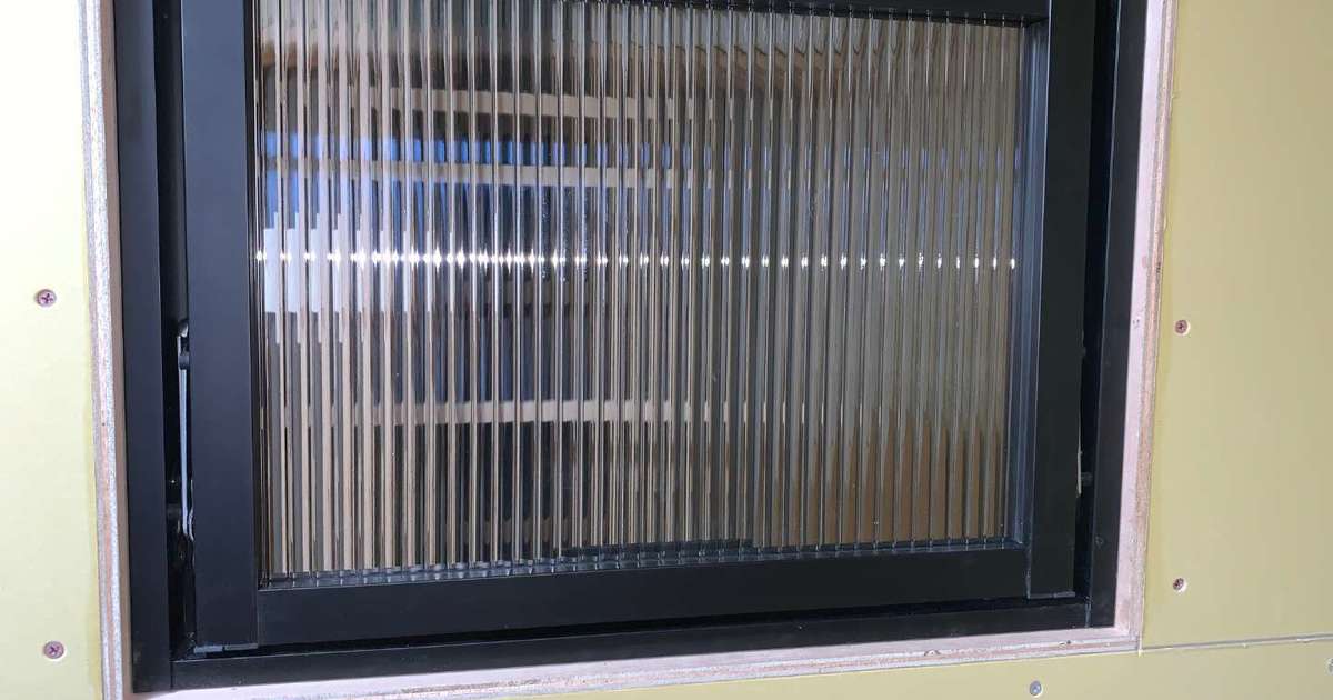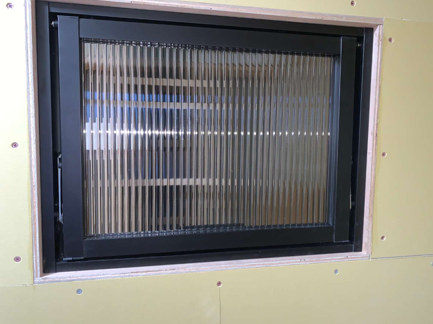 今回のデザインは、フレームはブラックに、ガラスの種類もたくさんあります。こちらのデザインはモールと言うタイプの突き出し窓です。