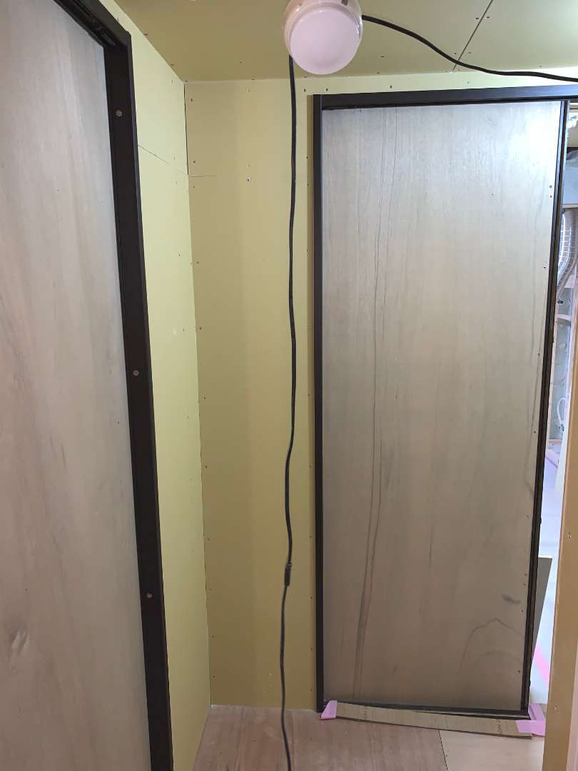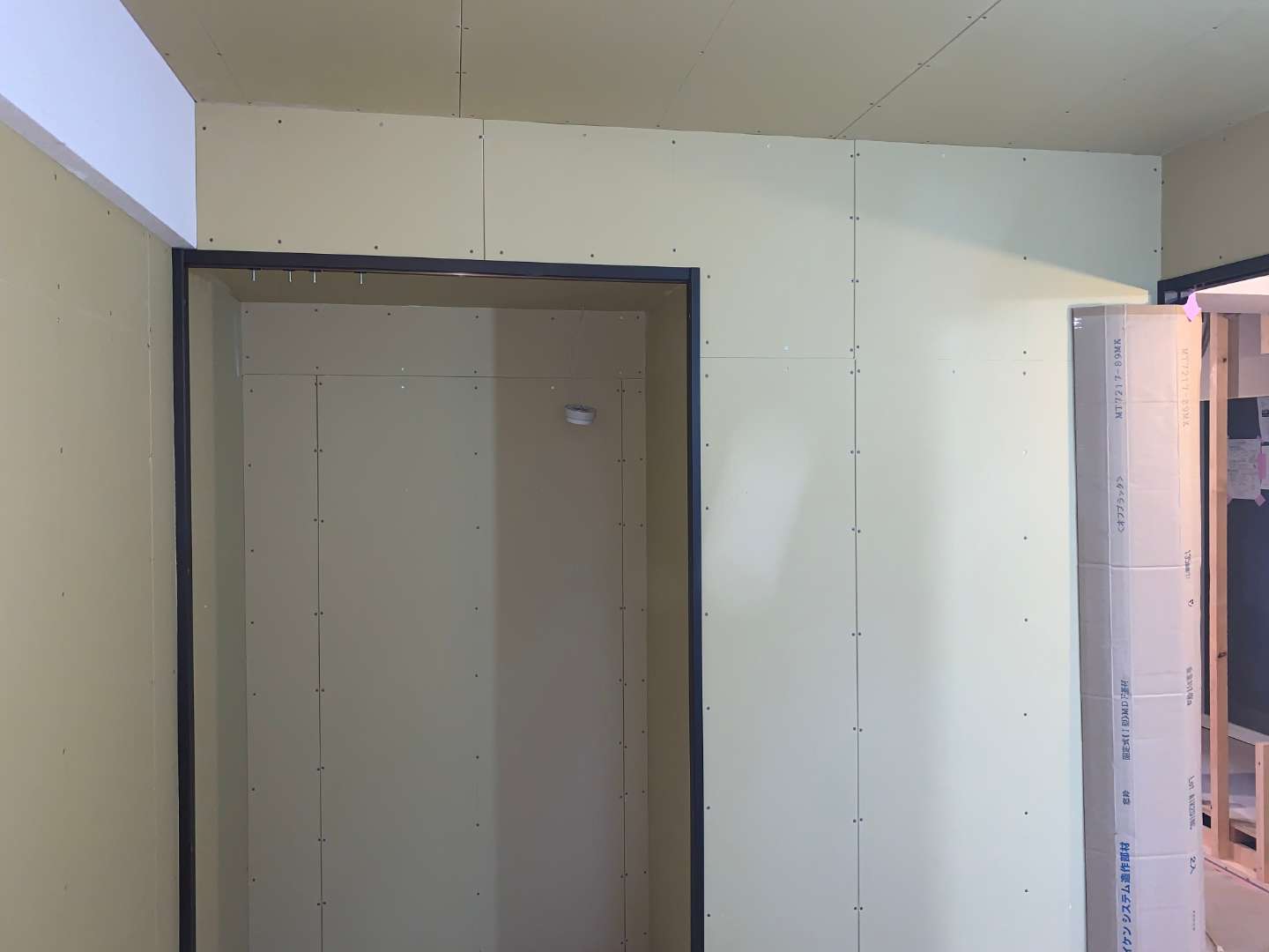 前日に続き、各部屋の壁や天井のボード貼りをしています。