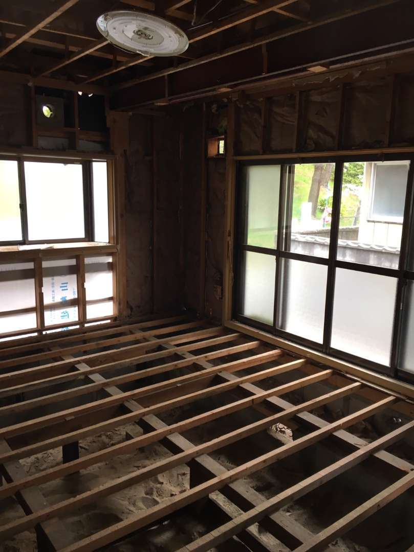 ベニヤ板が全て貼り終わり、次にフローリングを貼っていきます。 まだ、貼り始めたばかりですけど、...