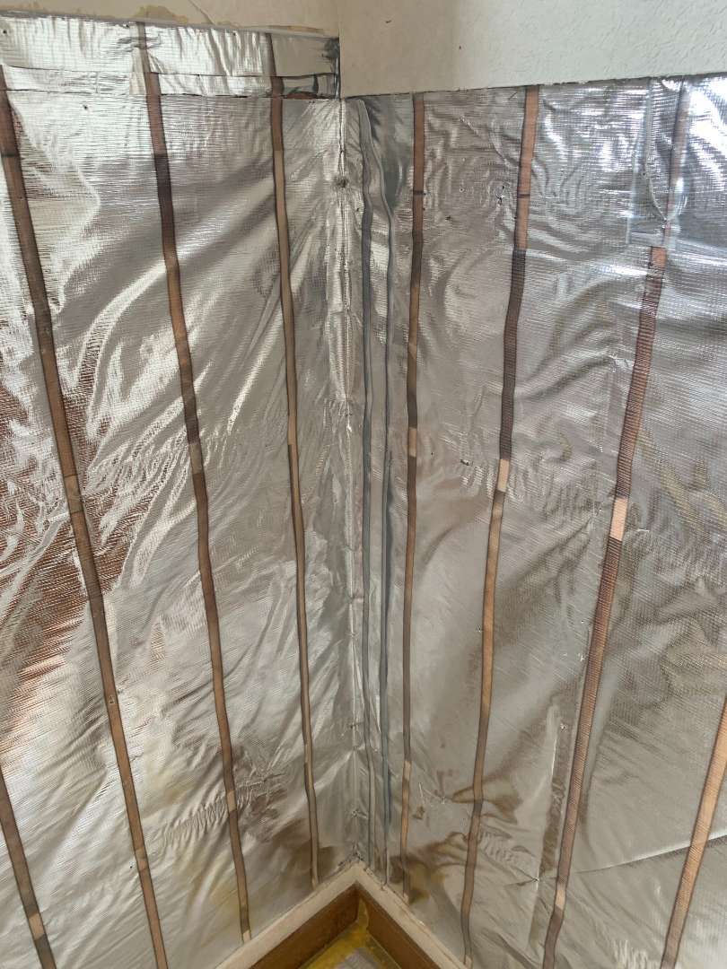ベニヤ板が全て貼り終わり、次にフローリングを貼っていきます。 まだ、貼り始めたばかりですけど、...