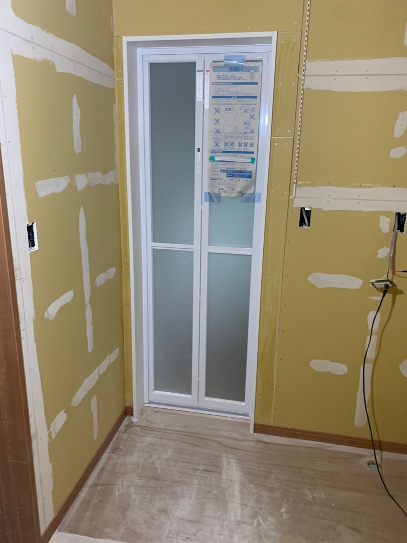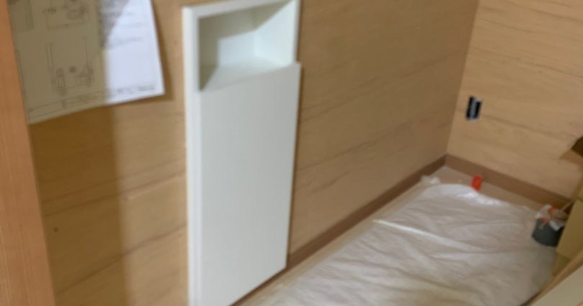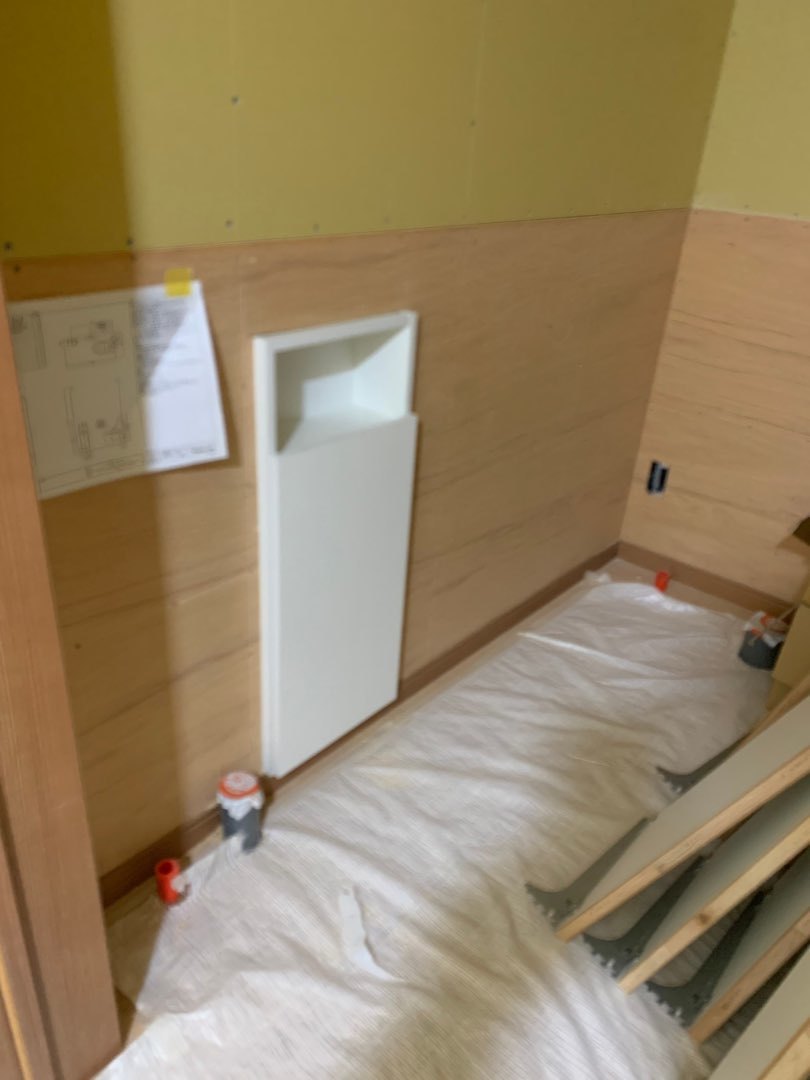 トイレ埋込収納・ユニットバス(UB)枠取付工事をしています。