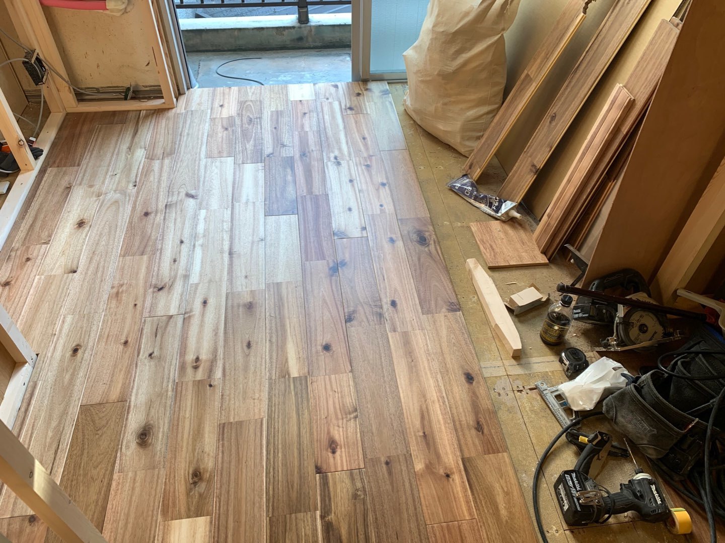 マンション1DKの床貼り工事をしています。